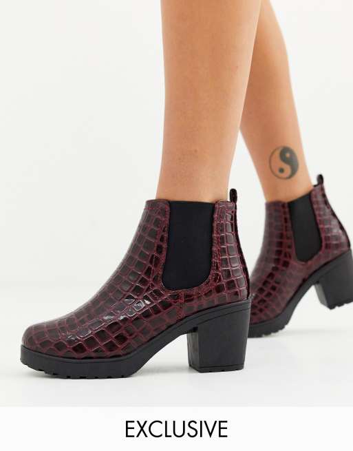 - impact round block heel ankle boots in burgundy patent