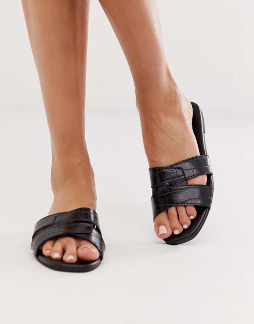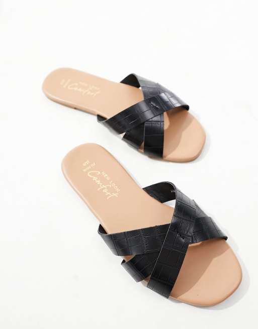 Product id: New look cross strap flat slider 2025 sandal in black croc